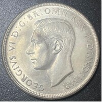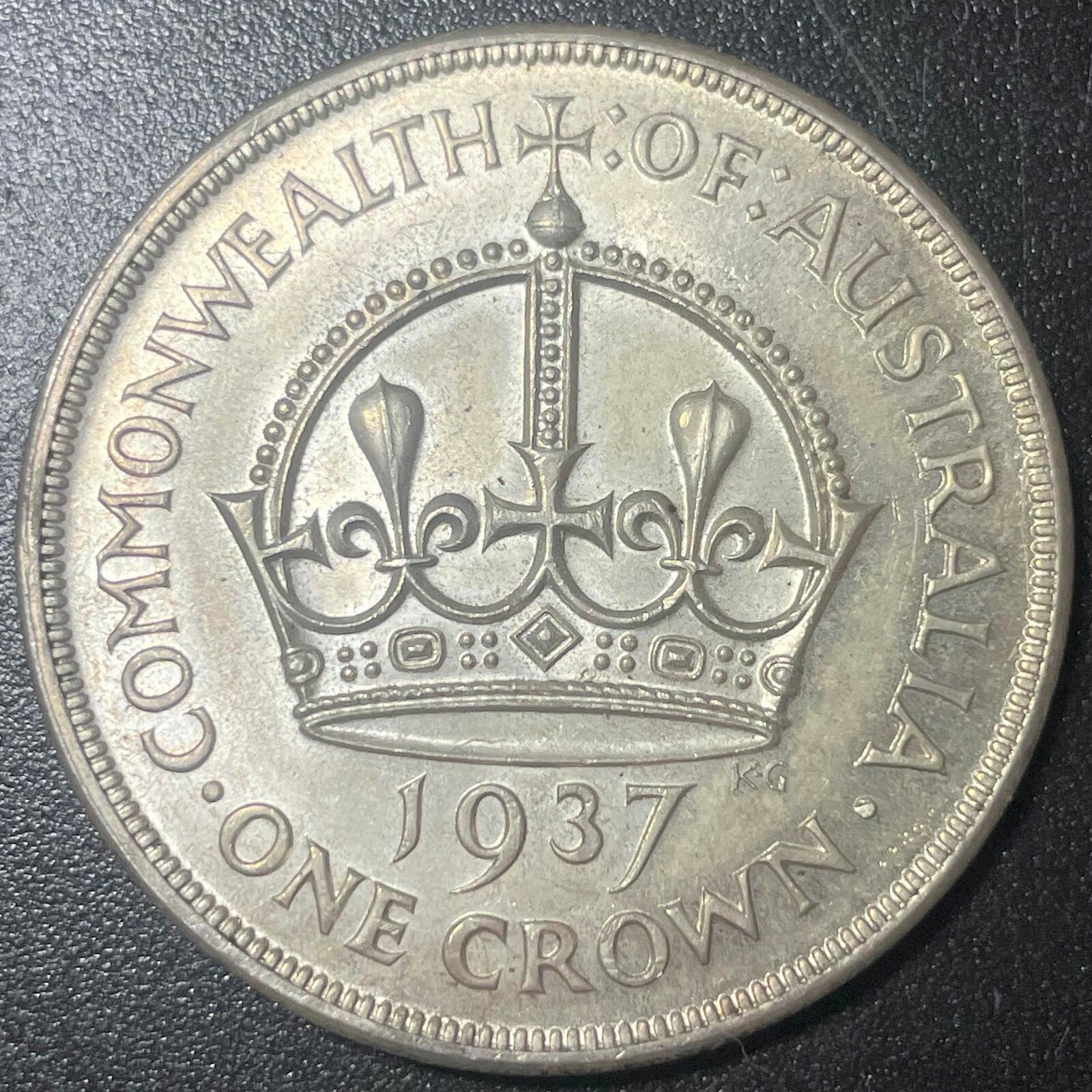 In 1937 and 1938, the silver Australian Crown was exclusively minted in Melbourne. It features a royal crown design on the reverse, created by George Kruger Gray, and a portrait of George VI on the obverse, designed by Thomas H Paget. The coin holds a denomination of 5 shillings.