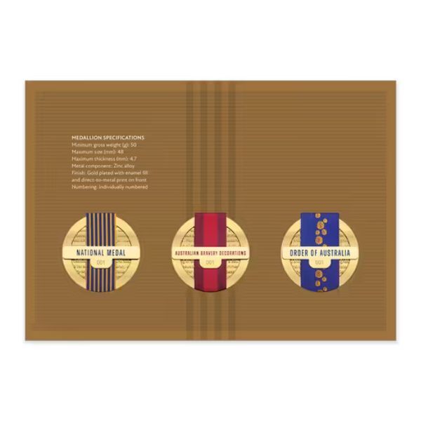 Includes three commemorative medallions honouring the Order of Australia, Australian Bravery Decorations and National Medal