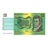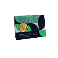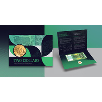 The image features the Australian two-dollar coin and note, showcasing a design with an Aboriginal elder on the coin, symbolizing Indigenous heritage, alongside Queen Elizabeth II’s profile. The note displays a sheep and the serial number "LGN 242439," reflecting agricultural roots and authenticity. The green commemorative packaging with an insert adds a collector-friendly touch.