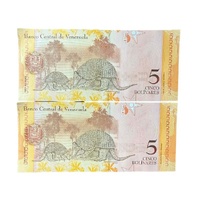 - Pair of two consecutive serial numbered 5 Bolivares banknotes from Venezuela's 2007 issue, enhancing collectibility through their sequential pairing and pristine state.