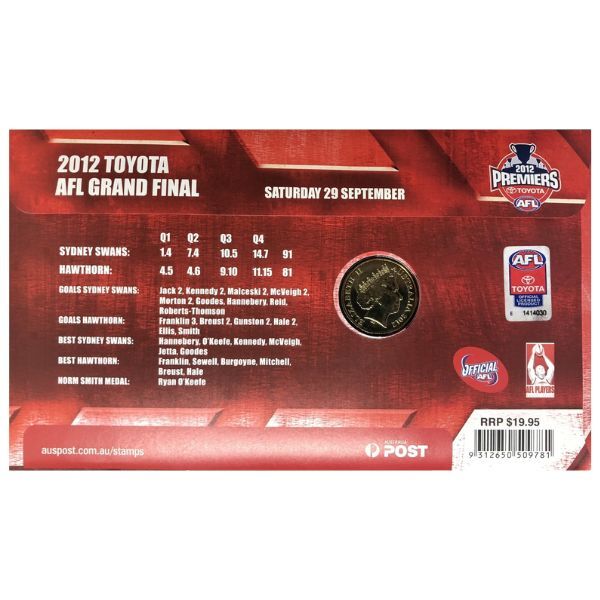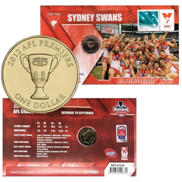 This First Day Cover celebrates the Sydney Swans victory in the Australian Football Leagues Grand final of 2012. With the Royal Australian Mint Produced $1 coin showcasing an image of the Premiership Trophy. Accompanied by matching theme stamps and cover photo of all the Hawks team members of that grand final. A must for the PNC collector, AFL supporter or sports enthusiast.