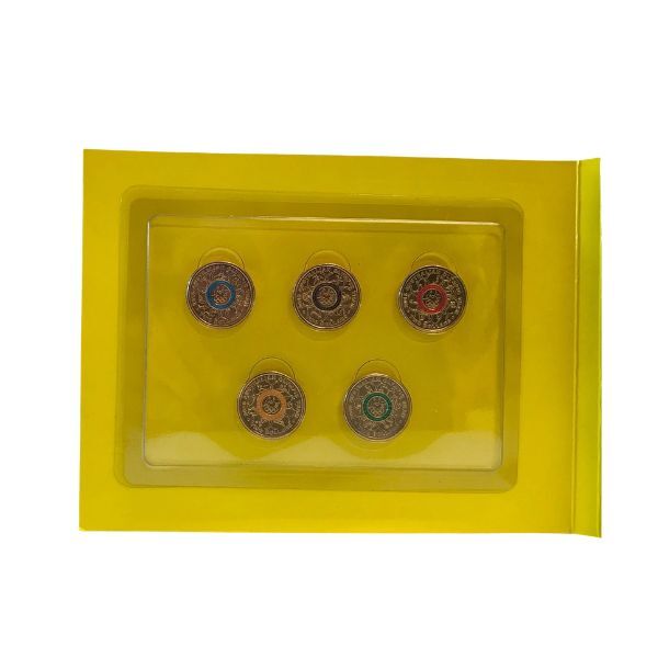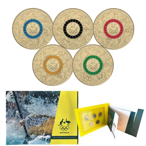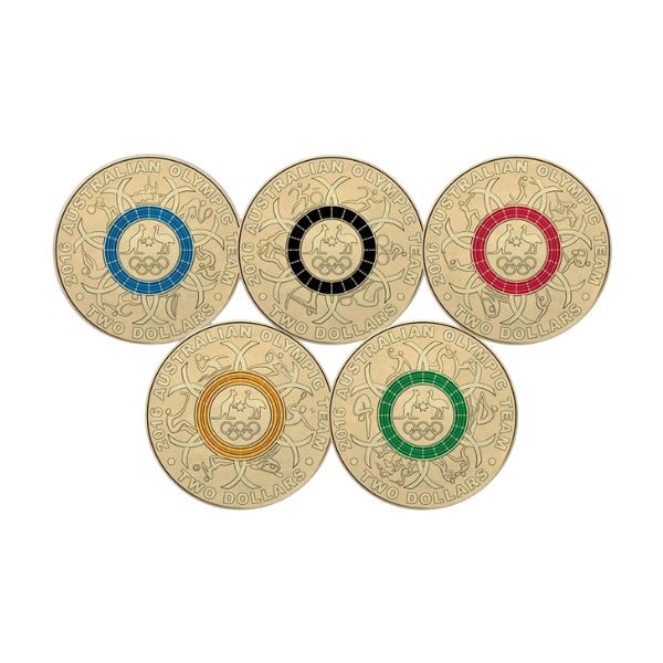 - Complete set of five coloured $2 uncirculated coins, each featuring one of the iconic Olympic rings in blue, black, red, yellow, and green, symbolizing the unity of the Olympic movement.