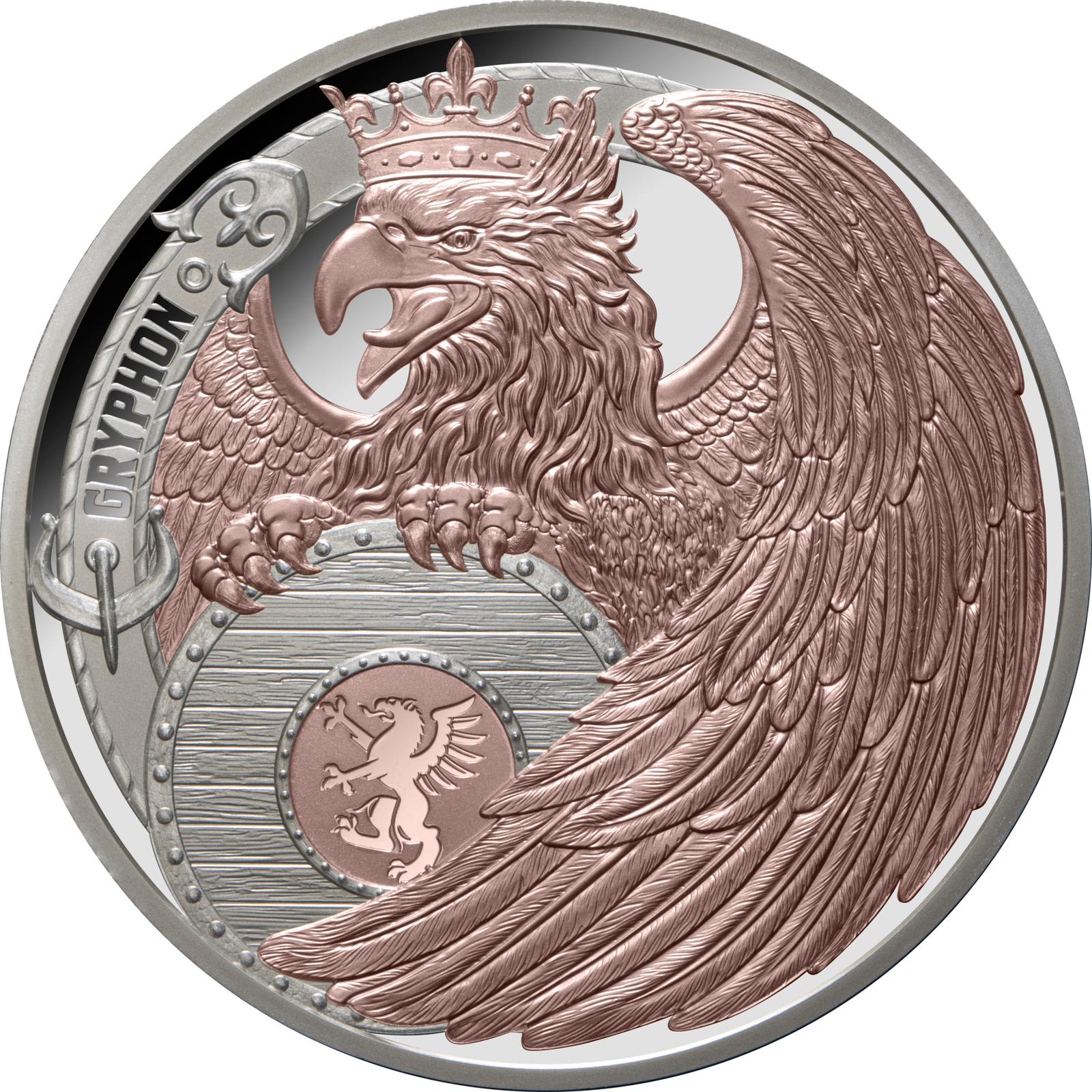 The 2024 Gryphon $1 1oz Rose Gold-Plated Silver Proof Coin breathes life into this historic emblem with a strikingly detailed portrayal of a female gryphon, bathed in ROSE GOLD, fiercely guarding a shield. The reverse of this legal tender coin, struck from 99.9% PURE SILVER, radiates an aura of majesty and power, capturing the essence of the gryphon's legendary status.
