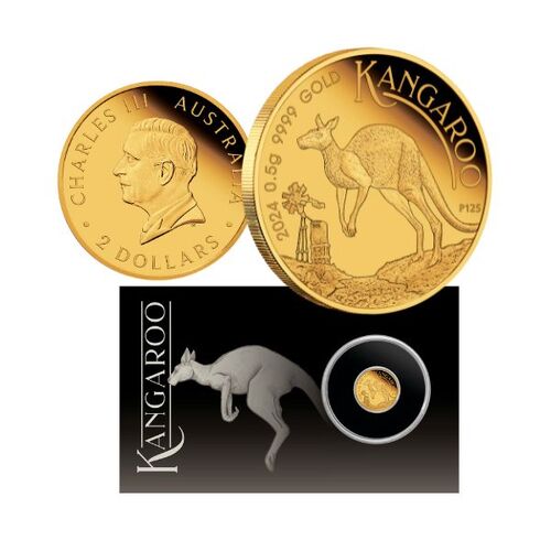 Introducing the 2024 Mini Roo 0.5g Gold in Card. The cute Mini Roo returns in 2024 with a new coin design. This highly affordable gold coin would make a wonderful gift or treasured keepsake. Struck by The Perth Mint from 0.5g of 99.99% pure gold in proof quality, the coin is issued as legal tender under the Australian Currency Act 1965.