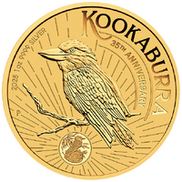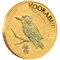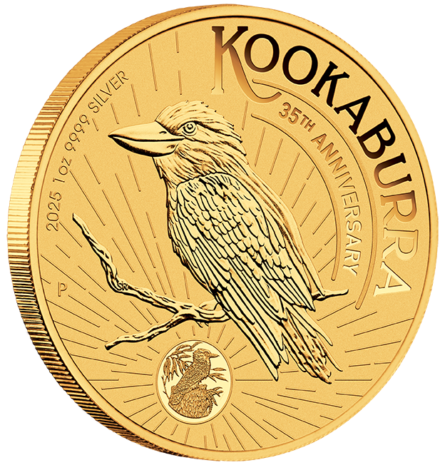 Reverse features "KOOKABURRA 35TH ANNIVERSARY" inscription, Perth Mint's 'P' mintmark, and a miniature tribute to the original design.