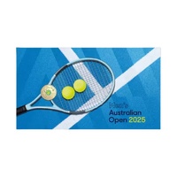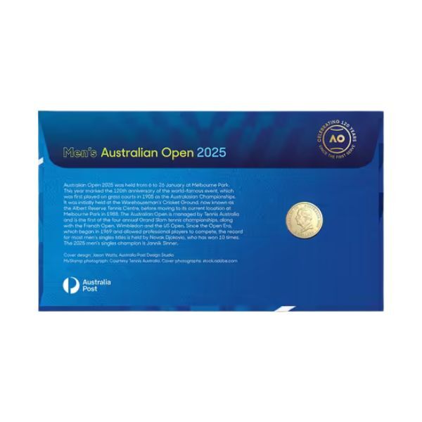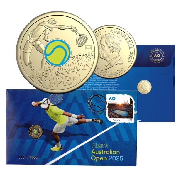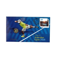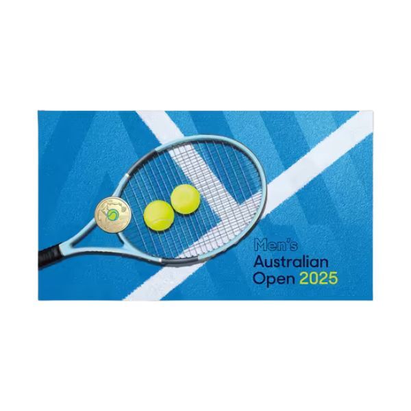 This dynamic 2025 PNC salutes the Men’s Australian Open and the event's 120th anniversary at Melbourne Park, spotlighting a century-plus of world-class tennis on the hallowed grass of the Albert Ground and beyond. At its core is the exclusive coloured $2 coin with a striking yellow tennis ball and blue swoosh – unique to this release – alongside a subtle envelope privy mark that sets it apart from all other 2025 editions. The reverse bursts with energy, depicting a male player in powerful action with racket poised, embodying the intensity and precision of the men's game over the Al/Br finish.