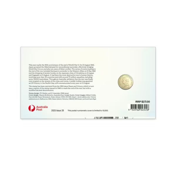 Marking 80 years since the end of the Second World War, this limited-edition Postal Numismatic Cover beautifully captures the solemn spirit of remembrance with a vibrant $2 coloured circulating coin at its heart. The coin’s striking reverse features a wreath of eight vivid red poppies, each bloom symbolising a decade of peace since 1945, interwoven with native flora and the heartfelt inscriptions "REMEMBERING" and "80 YEARS." Encased in a premium illustrated envelope adorned with subtle wartime imagery, this PNC is a powerful tribute to courage, sacrifice, and resilience—perfect for honouring veterans and enriching any collection with historical depth and emotional resonance.