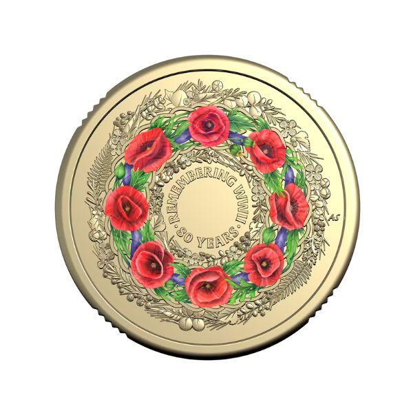 - Coloured $2 Poppy Wreath Coin: Vivid red poppies and green foliage in uncirculated finish, symbolising 80 years of remembrance.