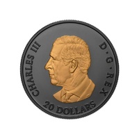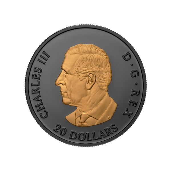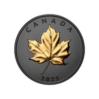 The 2025 $20 Elegant Maple Fine Silver Coin, struck from 1 oz of 99.99% pure silver by the Royal Canadian Mint, celebrates Canada’s iconic sugar maple leaf with sophisticated artistry. It features a detailed matte proof finish on the reverse, set against a striking black rhodium plated field for dramatic light-and-dark contrast. The obverse displays King Charles III’s effigy, highlighting the coin’s elegant design and collector appeal.