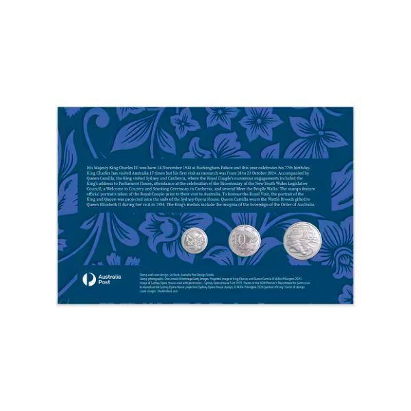 This exquisite limited edition PNC features three brilliant uncirculated circulating coins – 5c (echidna), 10c (lyrebird), and 20c (platypus) – each bearing the new portrait of His Majesty King Charles III by designer Dan Thorne on the obverse, paired with Stuart Devlin's timeless Australian fauna reverses. Presented on a luxurious deep-blue floral-themed envelope with a special pictorial postmark, commemorative $4.35 stamp depicting the King in ceremonial dress alongside the Sydney Opera House, and detailed historical notes on his Australian connections.