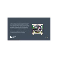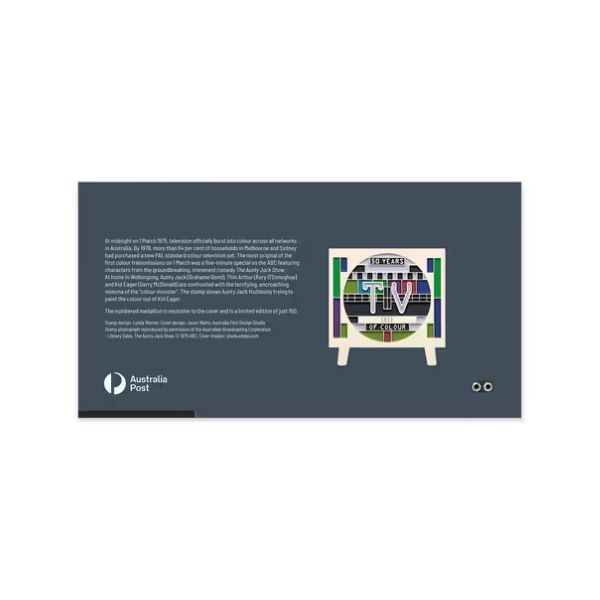 The cover complements the medallion with a matching stamp, postmarked and numbered, and a striking design that includes a vintage test pattern in bold yellow, red, and blue stripes, alongside a retro TV screen graphic. This PMC reflects the cultural shift that brought vivid colour to Australian homes, making it a beaut for collectors or anyone who remembers the magic of 1970s television. It’s a perfect keepsake to celebrate five decades of broadcast history, presented in an envelope that captures the era’s iconic style.