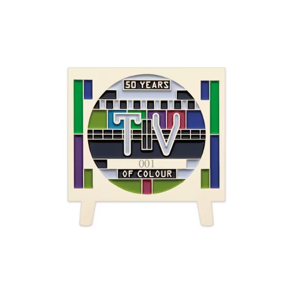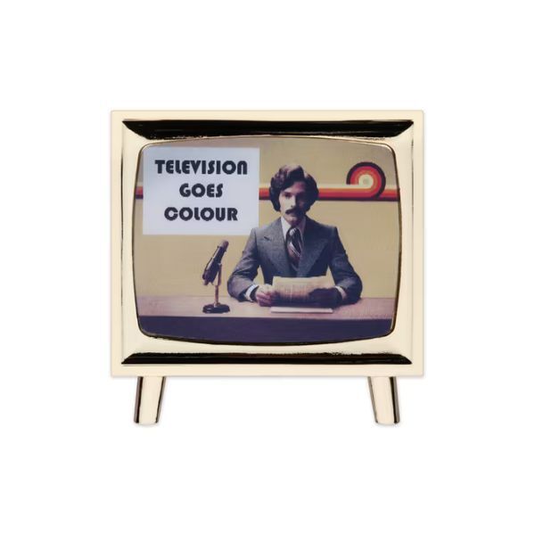 - Nostalgic Design: Features a silver-plated medallion shaped like a retro TV, with a newsreader announcing “Television Goes Colour” in a 1970s setting.