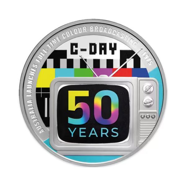 This exclusive 2025 PNC commemorates 50 years since Australia's "C-Day" in March 1975, when full-time colour broadcasting burst onto screens nationwide, transforming entertainment forever. Limited to just 200 sets worldwide, it pairs a .999 silver Perth Mint $1 coin with a vibrant 10-stamp pane recreating the iconic test pattern in multicoloured blocks, evoking the magic of those early broadcasts. The coin's reverse dazzles with a retro TV set displaying "50" in rainbow hues, flanked by the "C-DAY" banner and a classic antenna, all encircled by "AUSTRALIA LAUNCHES FULL TIME COLOUR BROADCASTING 1975" – a nostalgic nod to the era's technological leap.