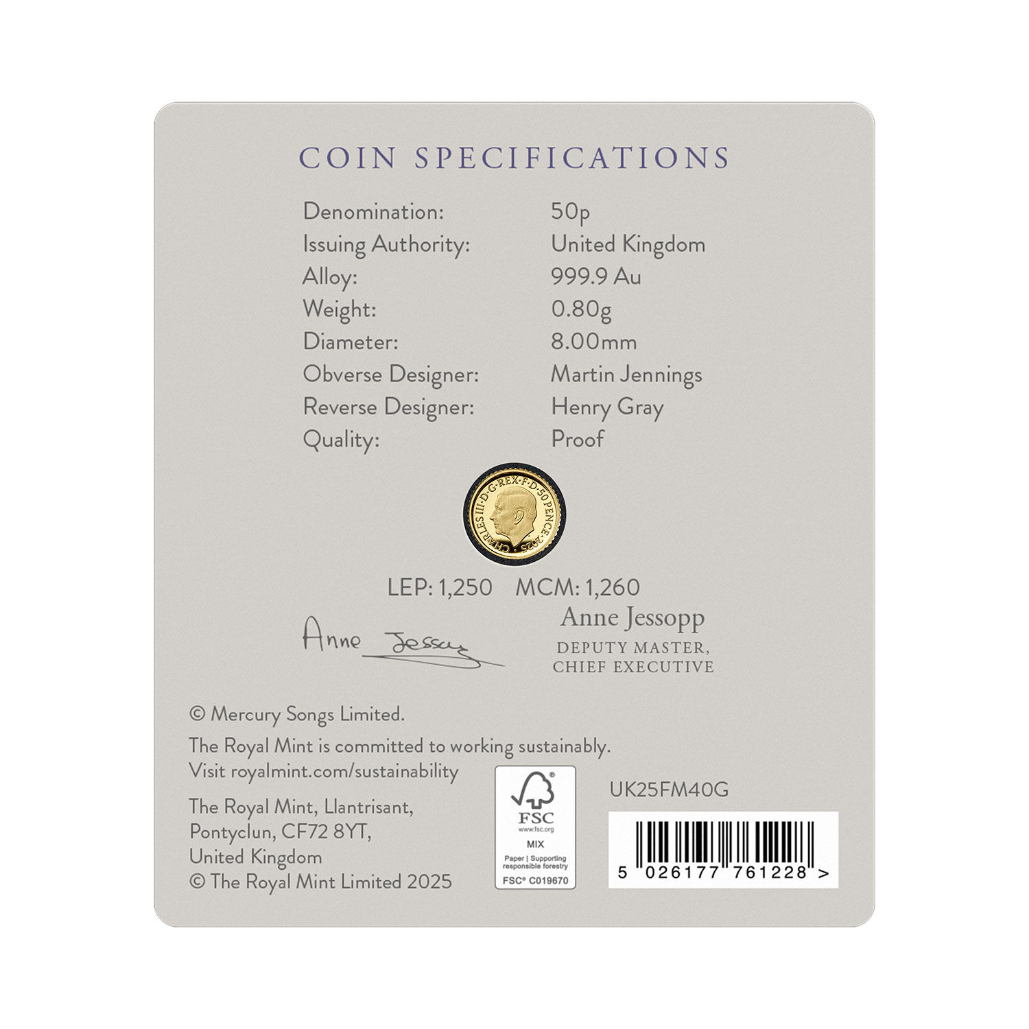 2025 50p Freddie Mercury 1/40oz Gold Proof Coin