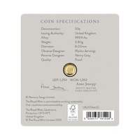 The obverse bears Martin Jennings’ official effigy of King Charles III, inscribed “CHARLES III · D · G · REX · F · D · 50 PENCE · 2025,” making this legal-tender 50 pence a stunning collision of royal tradition and rock immortality. Struck in pure 24-carat gold (.9999 fine), weighing 0.80 g and measuring just 8 mm in diameter, every exquisite detail shines with flawless proof quality—mirror fields and frosted relief that make Freddie leap off the coin.