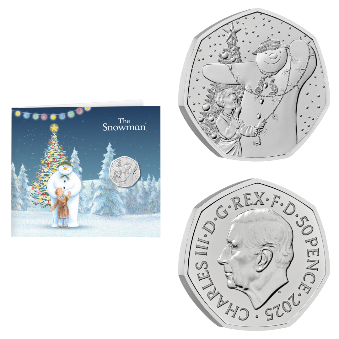 Commemorative 2025 50p The Snowman UK Brilliant Uncirculated Coin, celebrating the beloved children’s classic.