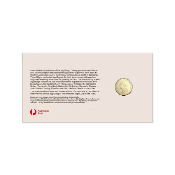 Celebrate Australia's quirky roadside icons with the 2025 Aussie Big Things 2 Design 1 Limited Edition Uncirculated Postal Numismatic Cover (PNC) – a standout collectible from Australia Post and the Royal Australian Mint. This limited edition honours the second series of Australia's beloved "Big Things," with Design 1 spotlighting a vibrant roadside attraction, paired with a matching $1 aluminium-bronze uncirculated coin.