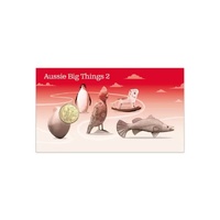 Celebrate Australia's quirky roadside icons with the 2025 Aussie Big Things 2 Design 2 Limited Edition Uncirculated Postal Numismatic Cover (PNC) – a standout collectible from Australia Post and the Royal Australian Mint. This limited edition continues the beloved "Aussie Big Things" series, with Design 2 featuring a delightful array of oversized landmarks including the Big Penguin, Big Galah, Big Rocking Horse, Big Barramundi, and Big Mango – all captured in charming detail on the vibrant envelope.