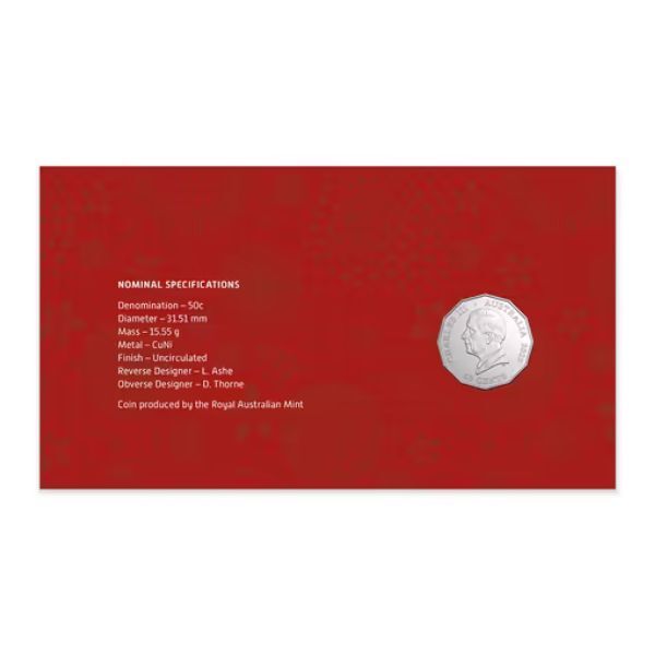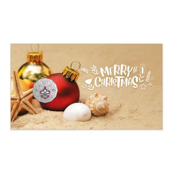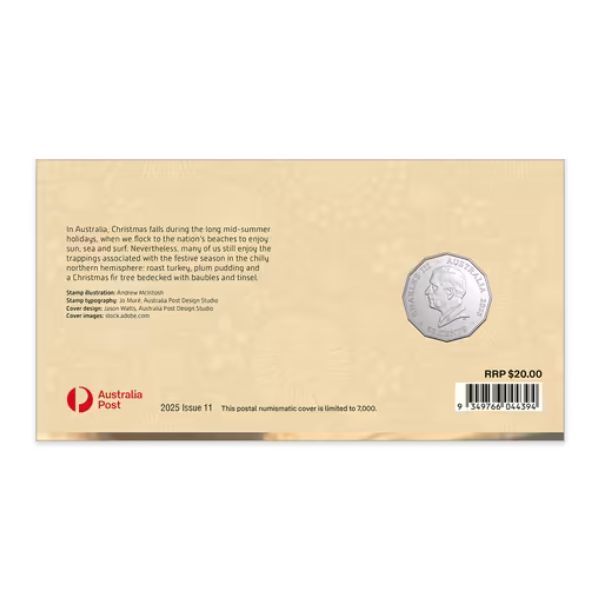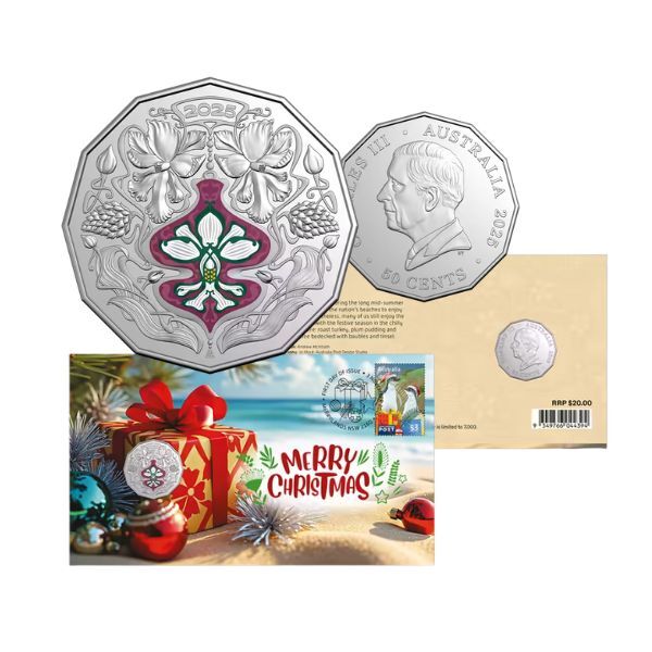 The 2025 Merry Christmas Postal Numismatic Cover is a limited-edition collectible (Limited to 7,000 worldwide) blending numismatic and postal heritage. It features a coloured 50-cent coin with festive native florals (waratahs, grapevines) in proof quality, set in a custom envelope with tropical holiday artwork—beach gifts, baubles, poinsettias, and a cockatoo. The obverse shows Queen Elizabeth II, while a special 2025 secular postmark adds philatelic value.