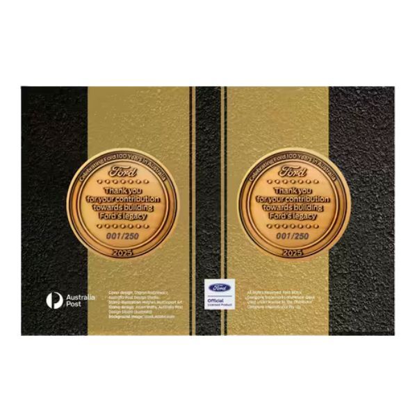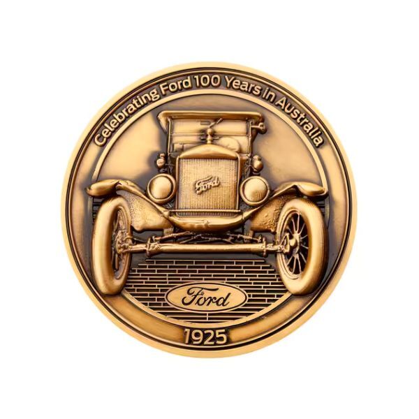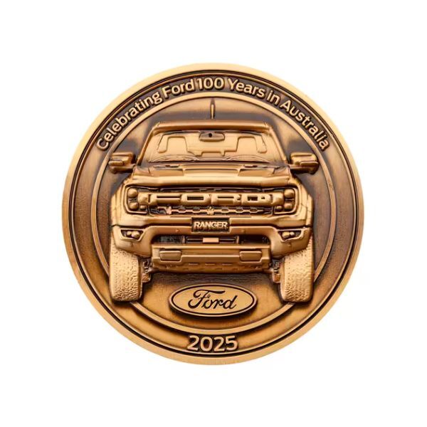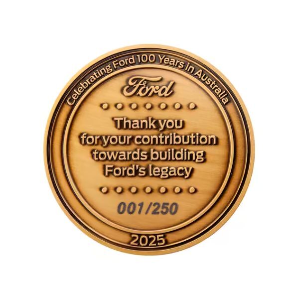 - Two 65mm antique silver-plated zinc alloy medallions: Ford Model T (1925) and Ford Ranger (2025), with high-relief detailing and "Celebrating Ford 100 Years in Australia" inscription