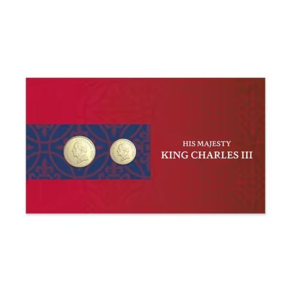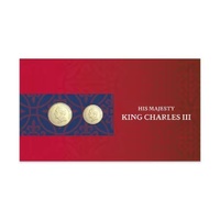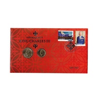 Both coins proudly display the official effigy of King Charles III on the obverse. The striking red PNC cover includes a special postmark and two commemorative stamps honouring the King, creating a beautiful and meaningful keepsake.