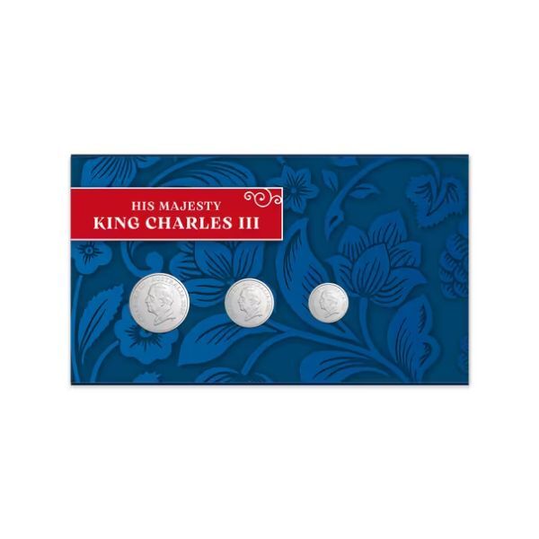 - Features uncirculated 5c, 10c, and 20c coins with unique reverse designs: the 5c depicts a young Charles with corgis, 10c shows him in naval uniform, and 20c honors his environmental legacy with a tree motif.