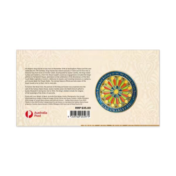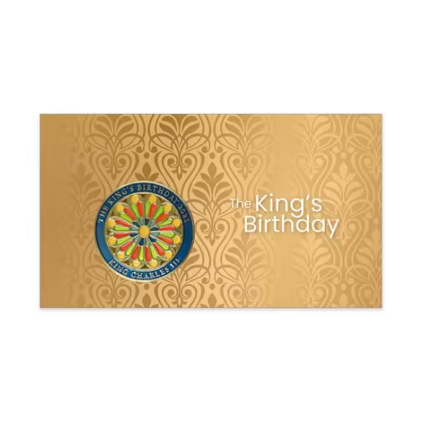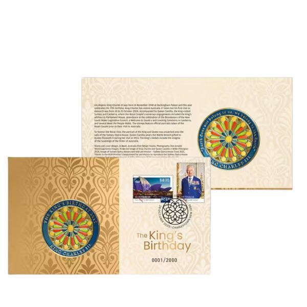 The 2025 The King's Birthday Philatelic Medallion Cover (PMC) is a distinguished collectible honoring King Charles III's official birthday with a limited run of 2,000 sets. This piece features a finely crafted gold-coloured zinc alloy medallion (55mm diameter), showcasing a detailed, multicoloured mandala design symbolizing celebration and heritage. Encased in a sophisticated envelope with gold foil accents and the royal crest, the PMC includes a booklet exploring Charles' journey—from his 1948 birth at Buckingham Palace during King George VI's reign to his 2022 coronation and lifelong commitment to sustainability, including his 17 visits to Australia and first as monarch in October 2024.