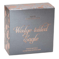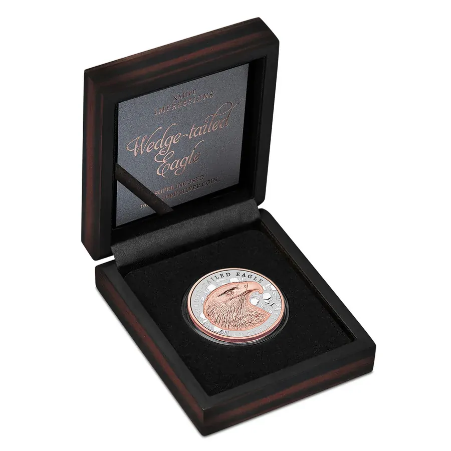 Experience the power and majesty of Australia’s largest bird of prey with the third release in The Coin Company’s acclaimed Native Impressions series. This 2025 1oz silver coin showcases a dramatic, super-incused Wedge-Tailed Eagle in exceptional high-relief detail, with selective 24-carat rose gold plating beautifully highlighting the eagle’s head, beak and feathers, as well as the outer rim and edge. The background features intricately struck banksia flowers, creating a stunning contrast between the rose-gold eagle and the brilliant silver field.