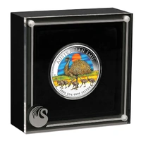Capture the majestic spirit of Australia's iconic flightless bird with the 2026 Australian Emu 1oz Silver Coloured Proof Coin from The Perth Mint. This beautifully coloured release showcases a proud adult emu striding across the outback landscape at sunset, its distinctive blue neck and shaggy brown plumage rendered in vivid detail, while a line of fluffy, striped chicks follows closely behind—highlighting the species' strong parental bond and nomadic family groups. The emu, Australia's largest bird and one of only two living ratites native to the continent, stands as a symbol of resilience, speed, and the vast open spaces of the Australian interior.