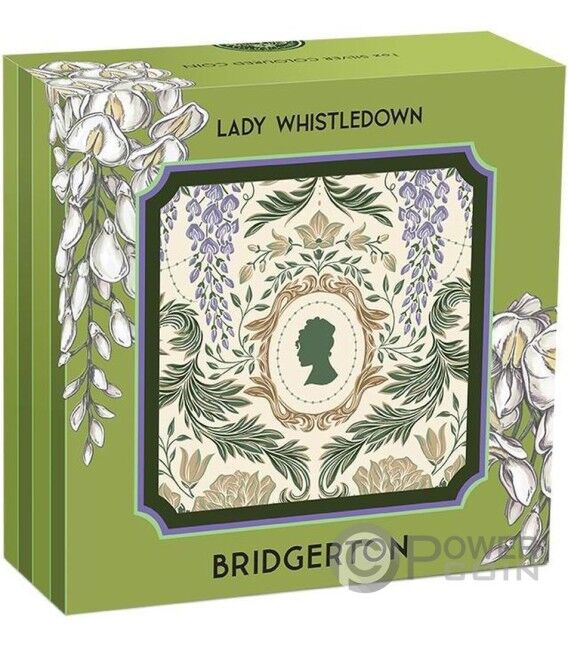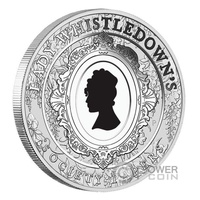 - Reverse showcases an elegant silhouette portrait of the enigmatic Lady Whistledown, framed by an ornate Regency-style border with the inscription "LADY WHISTLEDOWN’S SOCIETY PAPERS" and the Perth Mint’s ‘P’ mintmark.
