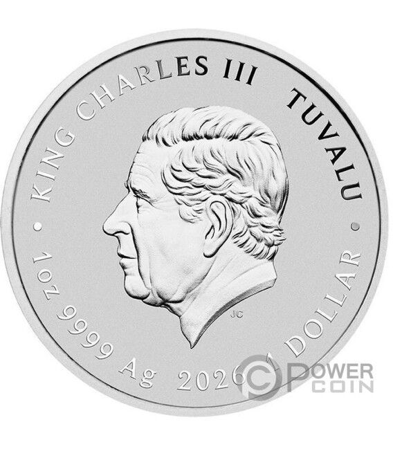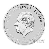 - Official Tuvalu legal tender, featuring the effigy of King Charles III on the obverse, along with inscriptions for weight, purity, denomination, year, and issuing country.