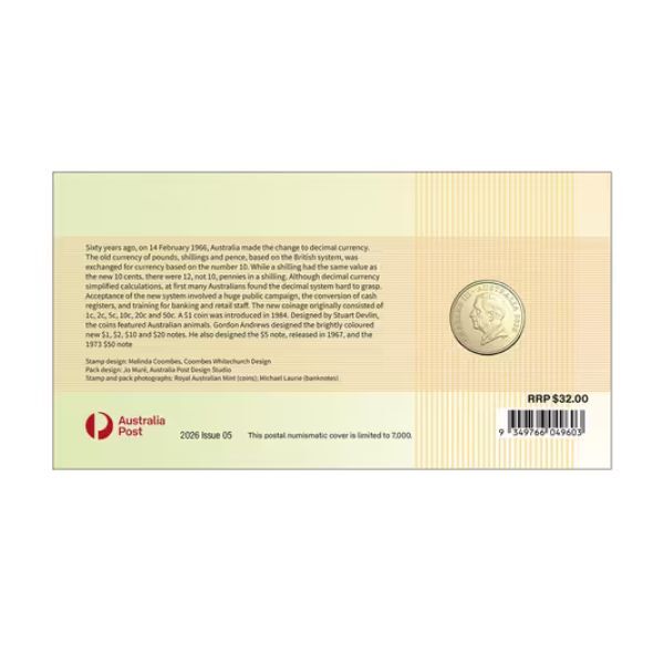 Limited to just 7,000 individually numbered covers worldwide, this official 2026 $1 Decimal Currency 60 Years PNC is a joint release from Australia Post and the Royal Australian Mint to celebrate 60 years since Australia switched to decimal currency on 14 February 1966.