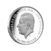 - Official Niue legal tender, featuring the effigy of King Charles III on the obverse, with inscriptions including "NIUE 2026", "ONE DOLLAR", and "1oz 999 SILVER".