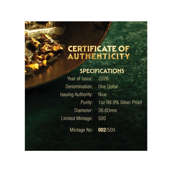 Celebrate the thrill of discovery with the 2026 $1 Gold Rush Coloured 1oz Silver Proof Coin, a tribute to some of history's most transformative events. This captivating release marks the 175th anniversary of Australia's 1851 Gold Rush, the 140th anniversary of South Africa's 1886 Witwatersrand Gold Rush, and the 130th anniversary of Canada's 1896 Klondike Gold Rush. Crafted with meticulous attention to detail, the coin's reverse brings the era to life through digital colour application, showcasing a determined miner knee-deep in adventure, sifting through vibrant waters for fortune. With a strictly limited mintage of only 500 pieces globally, this coin embodies the rarity and excitement that defined these historic rushes, making it a must-have for collectors seeking pieces with both historical significance and investment potential.