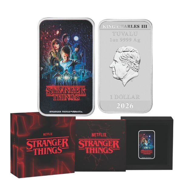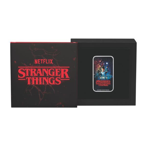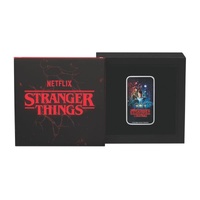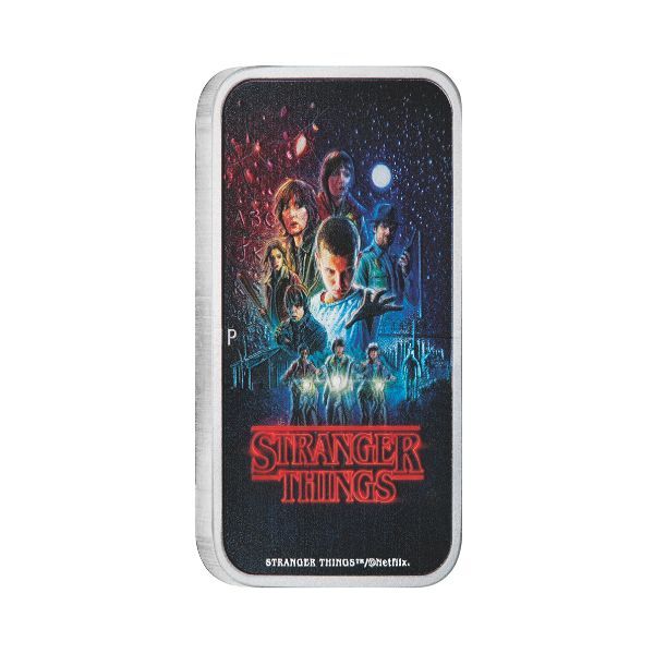Celebrate the global phenomenon of Stranger Things with this strictly limited 2026 1oz Silver Coloured Rectangular Coin from The Perth Mint, with a worldwide mintage of just 1,500 pieces. Marking the highly anticipated Season 1 tribute, the coin captures the essence of the Duffer Brothers’ groundbreaking series that debuted in 2016 and quickly became a cultural milestone. Its vibrant coloured design pays homage to the iconic poster art, featuring the core group of friends—Mike, Dustin, Lucas, and Eleven—set against the eerie Upside Down backdrop, evoking the thrill of 1980s Hawkins and the battle against supernatural forces.