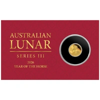 Embrace the spirit of the Lunar New Year with the 2026 $2 Year of the Horse Australian Lunar Series III 0.5g Gold Proof Coin, a stunning tribute to the seventh animal in the Chinese zodiac. Crafted by the renowned Perth Mint, this coin captures the horse's energetic essence through a finely detailed reverse design showing the majestic creature in mid-rear, surrounded by symbolic elements that evoke prosperity and vitality. As part of the ongoing Lunar Series III, which celebrates the 12-year cycle with exceptional artistry, this release provides an affordable entry into gold collecting amid rising precious metal values. With a strictly limited mintage of only 10,000 pieces available globally, it stands as a coveted item for numismatists and zodiac enthusiasts alike, blending cultural significance with investment appeal.