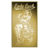 - Reverse features a glamorous pin-up style Lady Luck sitting confidently on oversized dice, surrounded by sparkling stars, evoking themes of fortune, chance, and vintage charm.