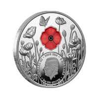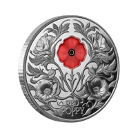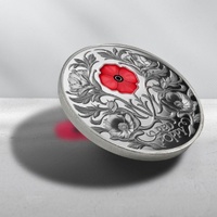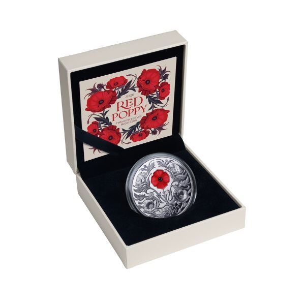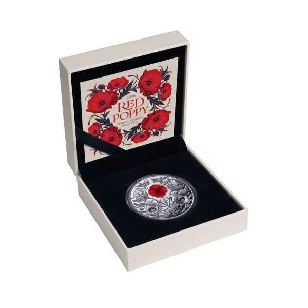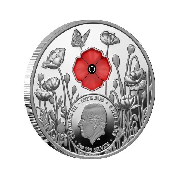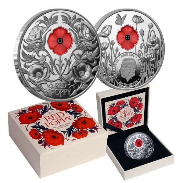 A stunning tribute to remembrance, this 2026 $5 Red Poppy Window 2oz Silver Proof Coin from Niue features an innovative transparent red poppy insert at its centre — the first of its kind. Struck from 2oz of 99.9% pure silver and measuring 50mm in diameter, the coin showcases intricate floral scrollwork in high relief surrounding the vivid red poppy window, symbolising the poppies that bloomed across the battlefields of WWI. The reverse design evokes solemn reflection, while the obverse carries the official Jody Clark effigy of King Charles III.