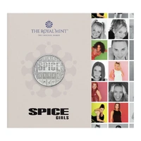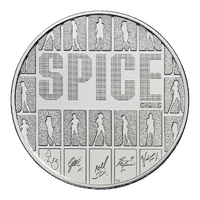 - Official UK legal tender £5 coin commemorating the iconic Spice Girls, celebrating their enduring impact on 90s pop culture and girl power.