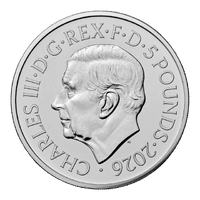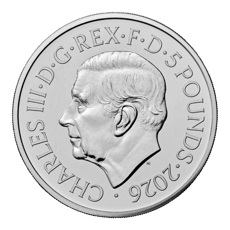 - Obverse bears the effigy of King Charles III by Martin Jennings, with inscriptions "CHARLES III · D · G · REX · F · D · 5 POUNDS · 2026" for classic British numismatic style.