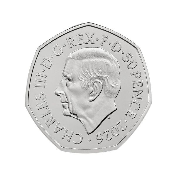 - Official UK legal tender 50p coin, obverse features Martin Jennings' effigy of King Charles III with standard inscriptions for denomination and year.