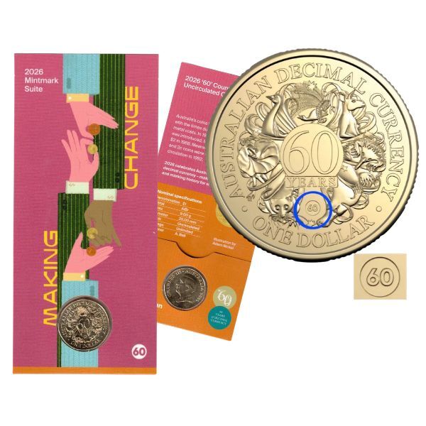 - Official Royal Australian Mint 2026 $1 coin with the special 60th Anniversary decimal currency reverse