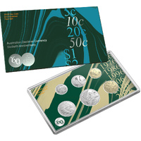Each coin is struck to uncirculated quality in standard circulation metals, showcasing fresh designs that pay tribute to 60 years of decimal innovation while retaining the familiar Australian fauna and flora themes. The set is beautifully presented in a premium green-marble-effect carded holder with gold foil accents and the "60 Years of Decimal Currency" theme, accompanied by a matching outer box featuring elegant marbled artwork in teal and gold tones. Limited to the Mint's standard production for this annual set (with the commemorative elements adding extra appeal), it's an essential addition for collectors marking this significant milestone in Australian numismatic history.