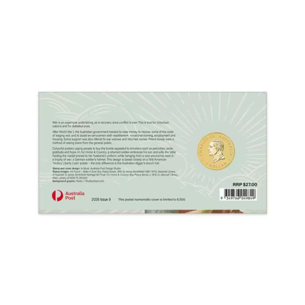 The PNC features a $1 uncirculated coin displaying the iconic slouch hat surrounded by poppies with the inscription “Lest We Forget” and the date “25 April 2026”. The beautifully illustrated cover reproduces classic World War I peace bond posters, including the powerful “For Home & Country – Buy Peace Bonds” artwork, along with a special postmark and commemorative stamps.
