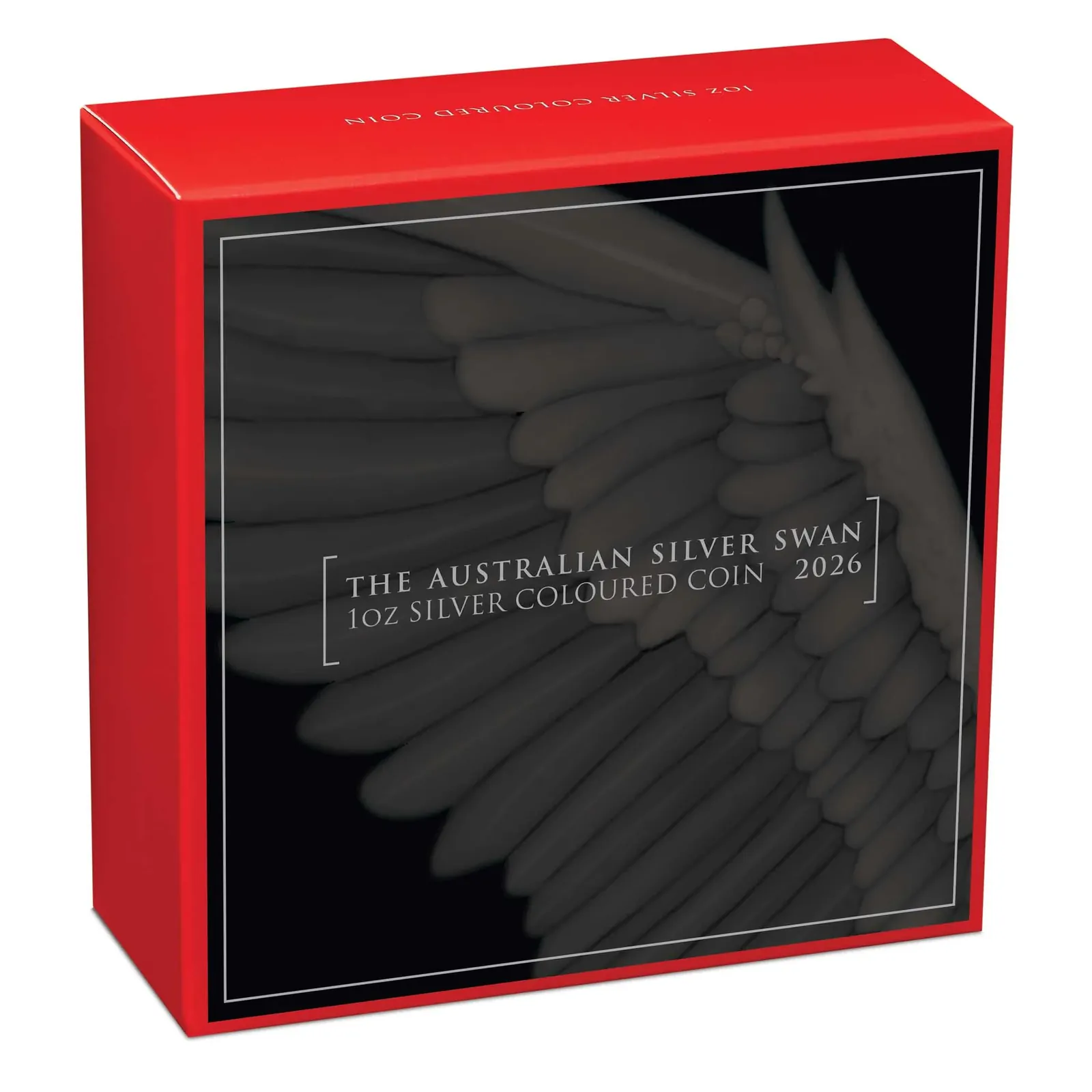 The reverse proudly displays the inscriptions “2026 1 OZ 9999 AUSTRALIAN SILVER SWAN” together with the special “P10” mintmark celebrating the 10th anniversary of the series and the designer’s initials “AH”. The obverse features the Dan Thorne effigy of His Majesty King Charles III with “AUSTRALIA” and the $1 denomination. Housed in a luxurious black display case with a clear lid and presented in a striking red illustrated shipper box showcasing a detailed swan wing motif, this low-mintage coloured proof is a true highlight for any Australian wildlife or Perth Mint collector.