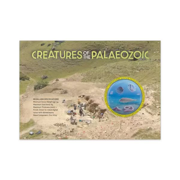 Step back half a billion years with the 2026 Creatures of the Palaeozoic Medallion Cover from Australia Post, a stunning tribute to the bizarre and groundbreaking creatures of the early Cambrian Period. The central 65mm medallion, crafted in zinc alloy with advanced digital printing and protective epoxy dome, vividly recreates real fossils from the world-famous Emu Bay Shale on Kangaroo Island—illustrated with palaeontological accuracy by Peter Trusler in partnership with expert Diego Garcia-Bellido. Paired with the four beautifully designed $1.70 stamps that highlight these ancient innovators and the evolutionary leap of hard-shelled life, this cover celebrates one of the most transformative chapters in Earth's history right here in Australia.