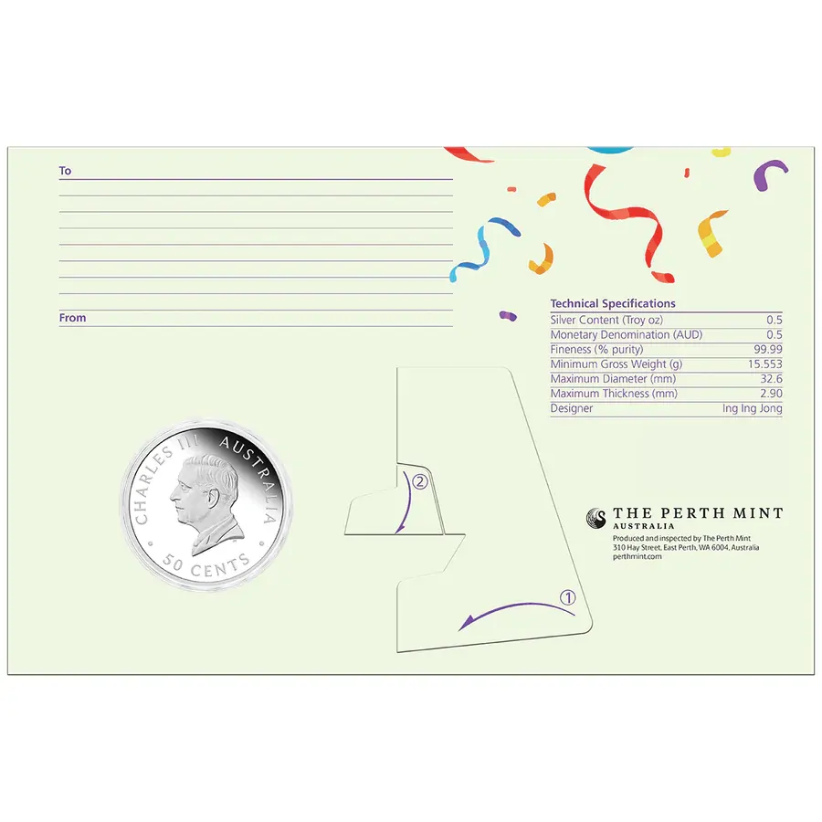 The obverse upholds regal tradition with Jody Clark's effigy of His Majesty King Charles III, facing left in detailed profile amid "CHARLES III AUSTRALIA 50 CENTS," grounding the playful design in sovereign elegance. Struck to proof standards in .999 fine silver weighing 15.55g with a 36.6mm diameter and 2.9mm thickness, this legal tender piece showcases mirror-polished fields and frosted reliefs enhanced by selective colouring for a three-dimensional sparkle that rivals any party favour. Presented in an official Perth Mint card with technical specifications, space for a personal message, and protective sleeve, it's the perfect ready-to-gift token for birthdays, anniversaries, or simply spreading Aussie cheer—combining collectible artistry with heartfelt sentiment.