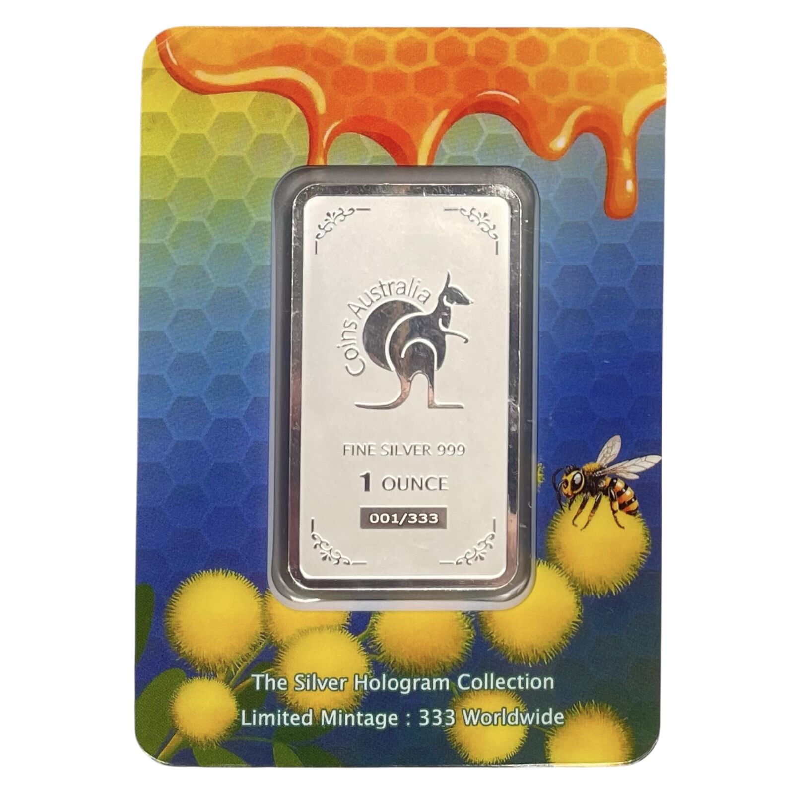 Launch your collection with the groundbreaking first release in the Silver Hologram Collection: the 2026 Honey Bee - Guardian of Balance - Wings of Wonder 1 oz .999 Silver Minted Bar from Coins Australia. This eye-catching 1-ounce bar, struck from ultra-pure .999 fine silver, celebrates the humble yet indispensable honey bee as a true guardian of ecological balance—vital pollinator supporting biodiversity, food production, and the harmony of nature. The reverse side features a beautifully detailed high-relief depiction of a honey bee in mid-flight, perched on a branch laden with intricate blossoms and berries, set against a mesmerizing advanced hologram background of radiant honeycomb patterns that shift through a stunning rainbow spectrum of blues, yellows, greens, and pinks as light plays across its surface, creating an almost magical, iridescent "Wings of Wonder" effect that brings the design vividly to life.