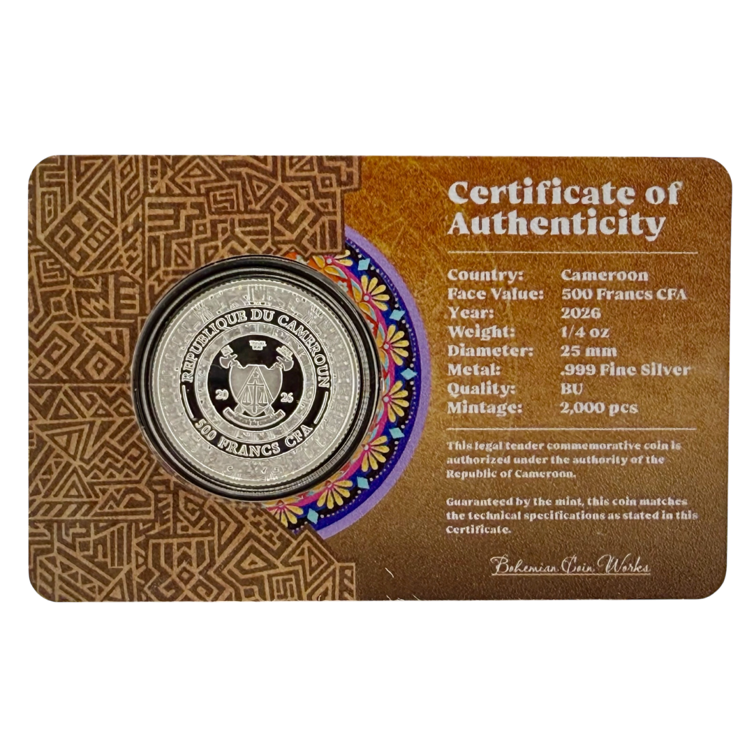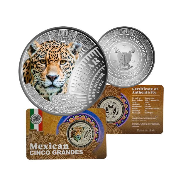 The first release in the exciting new Mexican Cinco Grandes (Big 5) series has arrived! This stunning 2026 Jaguar coin from Cameroon showcases a hyper-realistic, full-colour portrait of the majestic Mexican Jaguar — one of Mexico’s most powerful and iconic animals. Struck in 1/4 oz of .999 fine silver with brilliant uncirculated quality and vibrant digital colouring, the coin beautifully captures the intense stare and spotted coat of this apex predator.