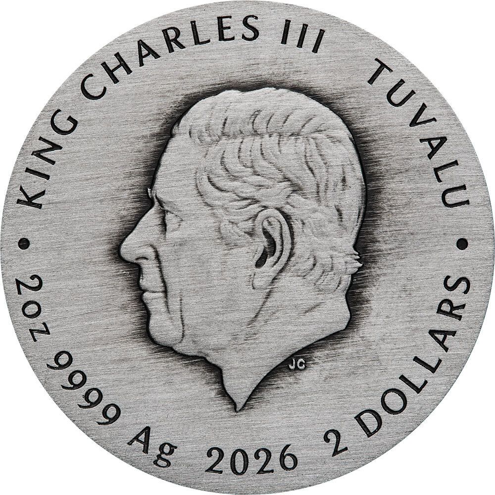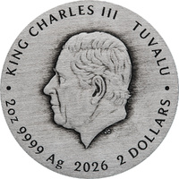 The 2026 Stranger Things Villains 2oz Silver Antiqued Coloured Coin captures the chilling essence of the Upside Down's most fearsome creatures from the hit Netflix series. Struck by the Tuvalu mint, this coin showcases the terrifying Mind Flayer at its center, flanked by snarling Demogorgons and swarming Demobats, all rendered with striking colour accents against an antiqued silver background that evokes the eerie, decayed atmosphere of the show's alternate dimension. The reverse design draws fans into the supernatural horror that defines Stranger Things, making it a must-have for enthusiasts of pop culture numismatics.